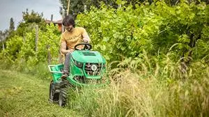 Das verstärkte Mähwerk besitzt drei versetzte Mähspindeln mit Quermessern. Dadurch wird das Schnittgut zuverlässig reduziert. Es eignet sich sowohl für Wildwuchs, Wiesen und Obstgärten als auch für gepflegte Rasenflächen. - Optimale Traktion