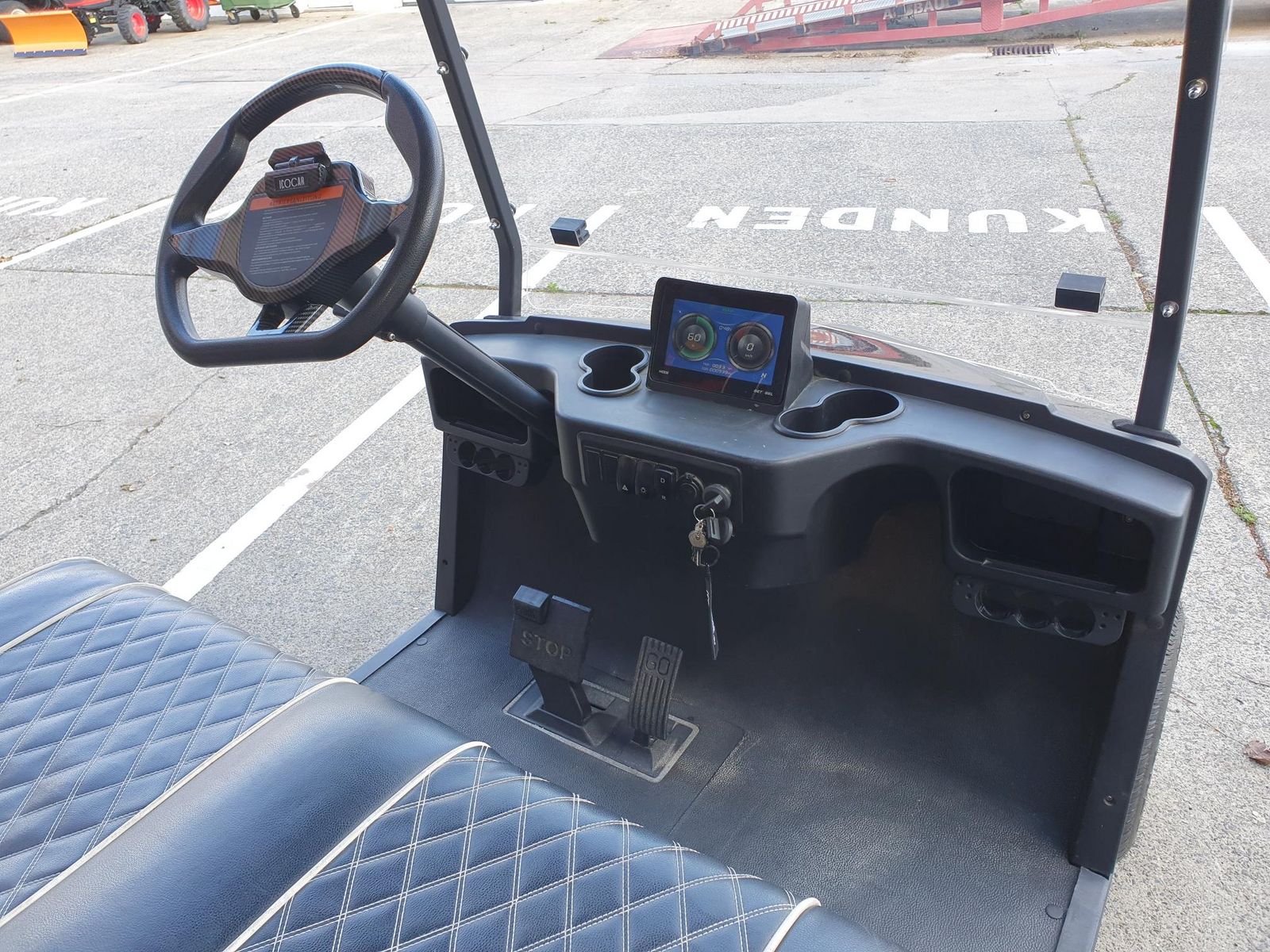 On-Board Ladegerät, Lichtanlage , Aluminiumrahmen, USB, 6×8 V Trojan T875 Batterien 1 Jahr alt, Zentalbefüllanlage, Premiumsitze schwarz, Classic Golflenkrad, 10″ Alufelgen, 7″ Digitaltachometer, Cargobox 110×60 cm.