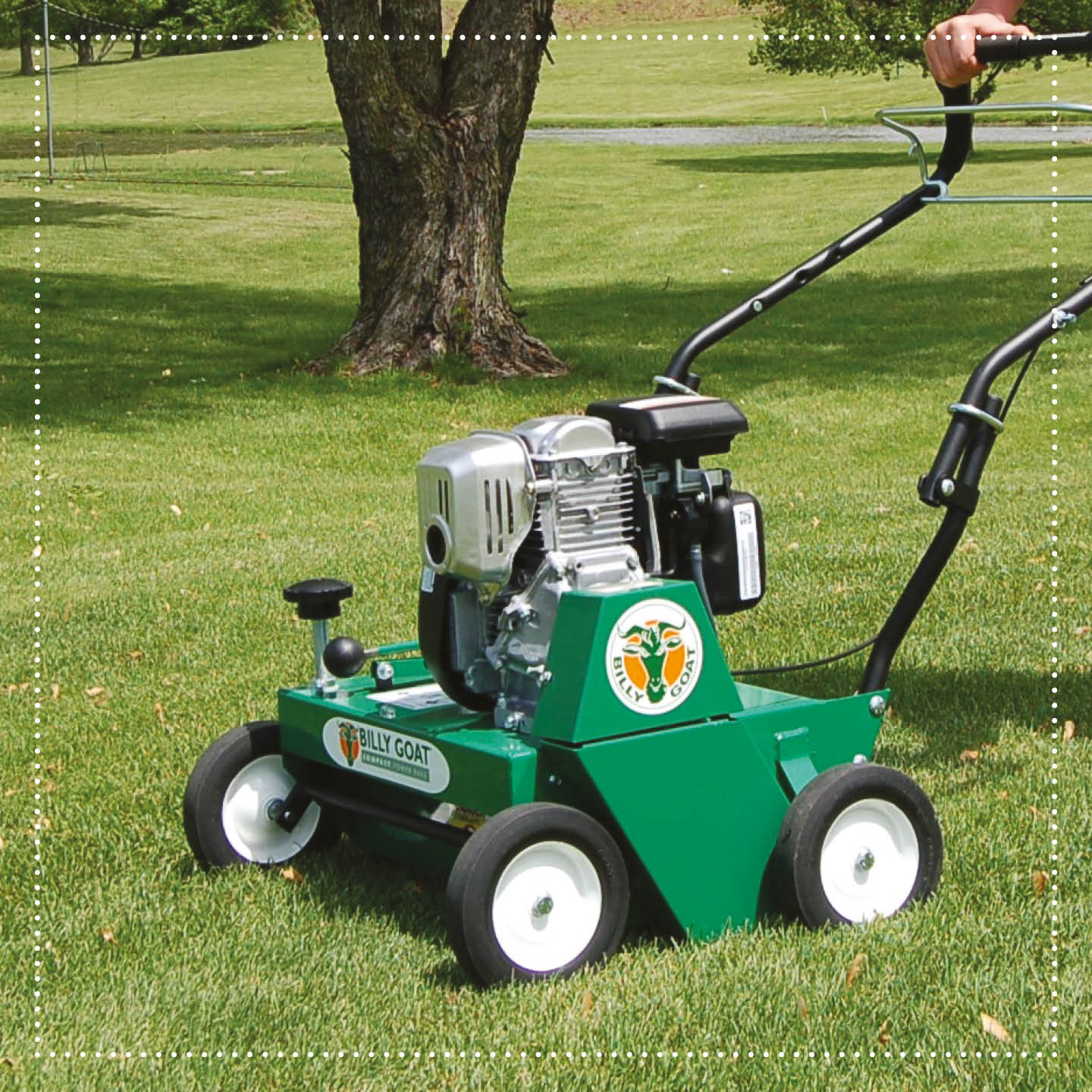 Wenn der Boden sehr verdichtet ist reicht normales Vertikutieren oftmals nicht mehr aus – das ist dann der Fall wenn Rasenflächen ständig betreten werden. Es bildet sich eine kompakte Oberfläche und die Qualität des Rasens verschlechtert sich. Hier wird empfohlen den Rasen zu aerifizieren! Durch die Aerifizierung des Rasens werden kleine Löcher in den Boden gestanzt die für eine verbesserte Zufuhr von Luft und Wasser sorgen. Dadurch gelangen wieder mehr Nährstoffe zu den Rasenwurzeln und der Rasen wächst gesünder und kräftiger nach. Das Sortiment von Billy Goat beinhaltet mehrere Aerifizierer wie zum Beispiel den PL1801H. Dieses Modell ist besonders kompakt und kann bis zu 2.000 m² pro Stunde aerifizieren.