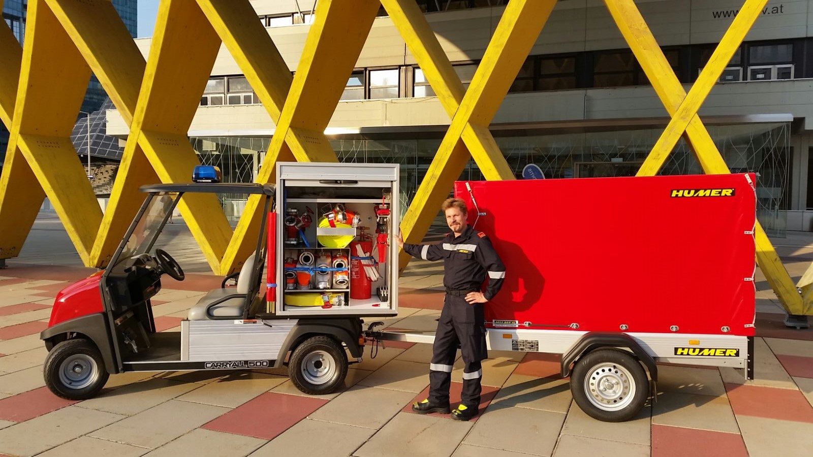 Voller Stolz durfte die Prochaska Handels GmbH das erste Club Car Elektro-Feuerwehrfahrzeug an die Betriebsfeuerwehr des Austria Center Vienna übergeben. Dieses besondere Fahrzeug verfügt über eine Sonderausstattung mit Atemluftfalschen und weiterer Spezialausrüstung on Board. Zudem befindet sich eine Drucksteigerungspumpe am Anhänger. Außerdem ist das Fahrzeug für die Straße zugelassen. Auf diese Weise gerüstet wird das Fahrzeug effizient seinen Beitrag zur Brandschutzsicherung des Austria Center Vienna leisten.